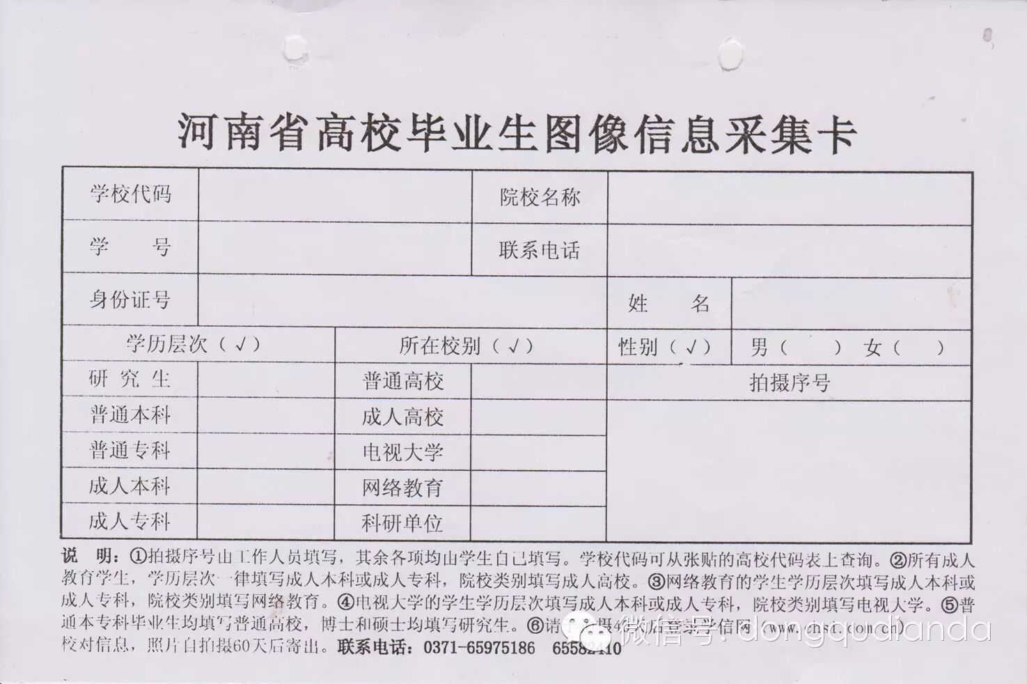 | 根据电大教务通知,2014级(秋)及往届全体国家开放大学(中央电大)在籍学生即将毕业,本学期为最后一个学期,为让大家顺利毕业,顺利拿到国家开放大学(中央电大)毕业证,现董老师把在郑州大学东区学习中心报名中央电大开放教育教育的同学,2014级(秋)国家开放大学(中央电大)开放教育学生毕业照片采集安排通知如下,望各位同学及时查看,并在规定时间内前去采集。 国家开放大学(中央电大)开放教育2014级(秋)学生毕业照片采集安排通知: 1、采集毕业照地点: 郑州市花园路84号(花园路纬一路交叉口西北角)新华通讯社河南分社。市内乘82路、29路、205路、9路等公交到花园路口站下车即可。 2、采集毕业照需带资料:身份证、学生证(如果学生证丢失可通过微信服务平台:dongqudianda,查询相关学籍信息)、20元信息采集费。学校名称:国家开放大学,院校代码:51161,姓名,身份证号,学号,学历层次根据自己的所学层次来选择,所在校别填写电视大学;这几项是必填项目,请大家填写时认真填写,不要填错,以后出现网上照片链接的现象。 图像采集卡样本